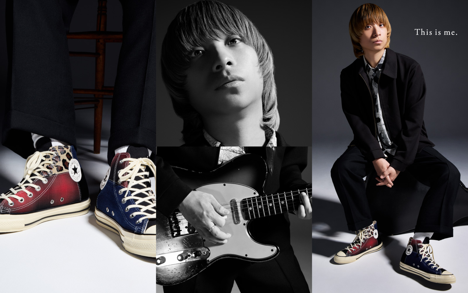 今回は、90年代グランジカルチャーにインスパイアされた異素材ミックスのモデル「ALL STAR AGED MATERIALBLOC HI」とともに「This is me.」の世界観を、ファッションを始め、様々なポートフォリオ撮影を手掛けてきた操上和美が撮影し表現。尾崎氏ならではの視点や感性、紡がれる言葉と佇まいなどを操上氏のフィルターを通すことでグラフィックに深みをもたらしている。