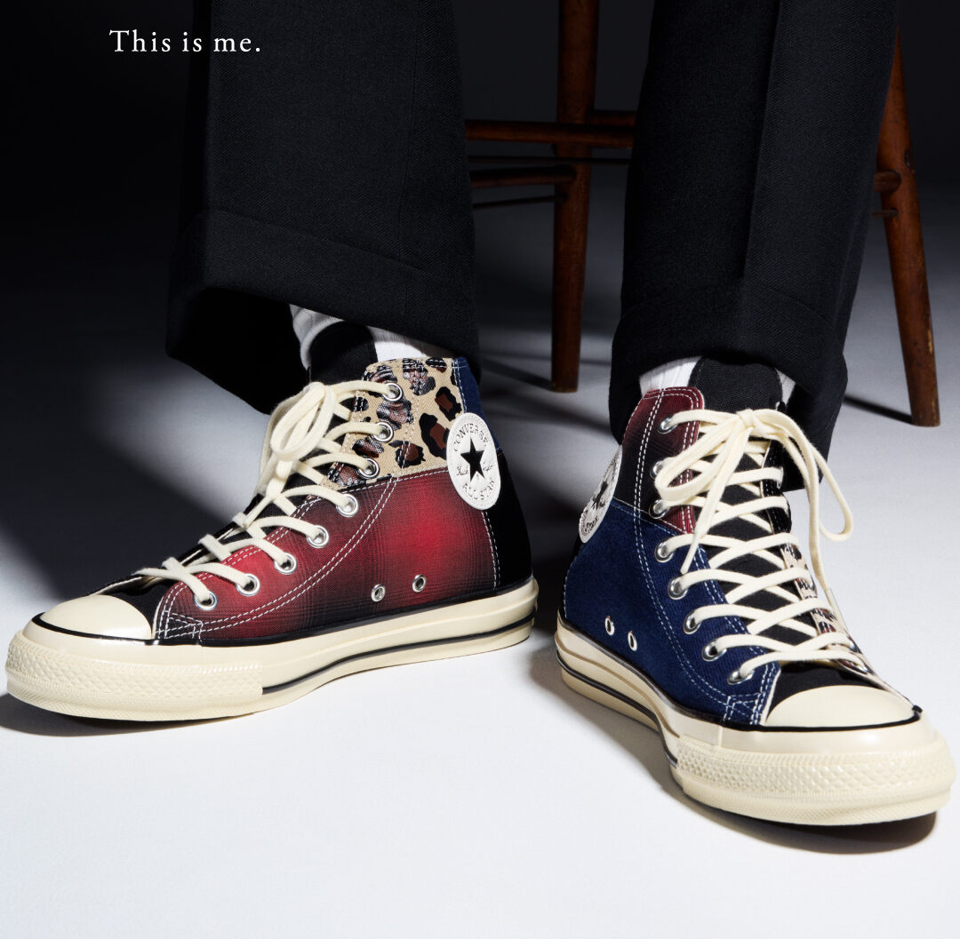 「ALL STAR AGED MATERIALBLOC HI」は、アーカイブのカラーブロックデザインをベースに、オンブレチェック、レパード、デニム、ベルベットという異素材を組み合わせたインパクトのあるデザインで、濃い生成りのテープやシューレースなどヴィンテージ感あるディテールが特徴的だ。
