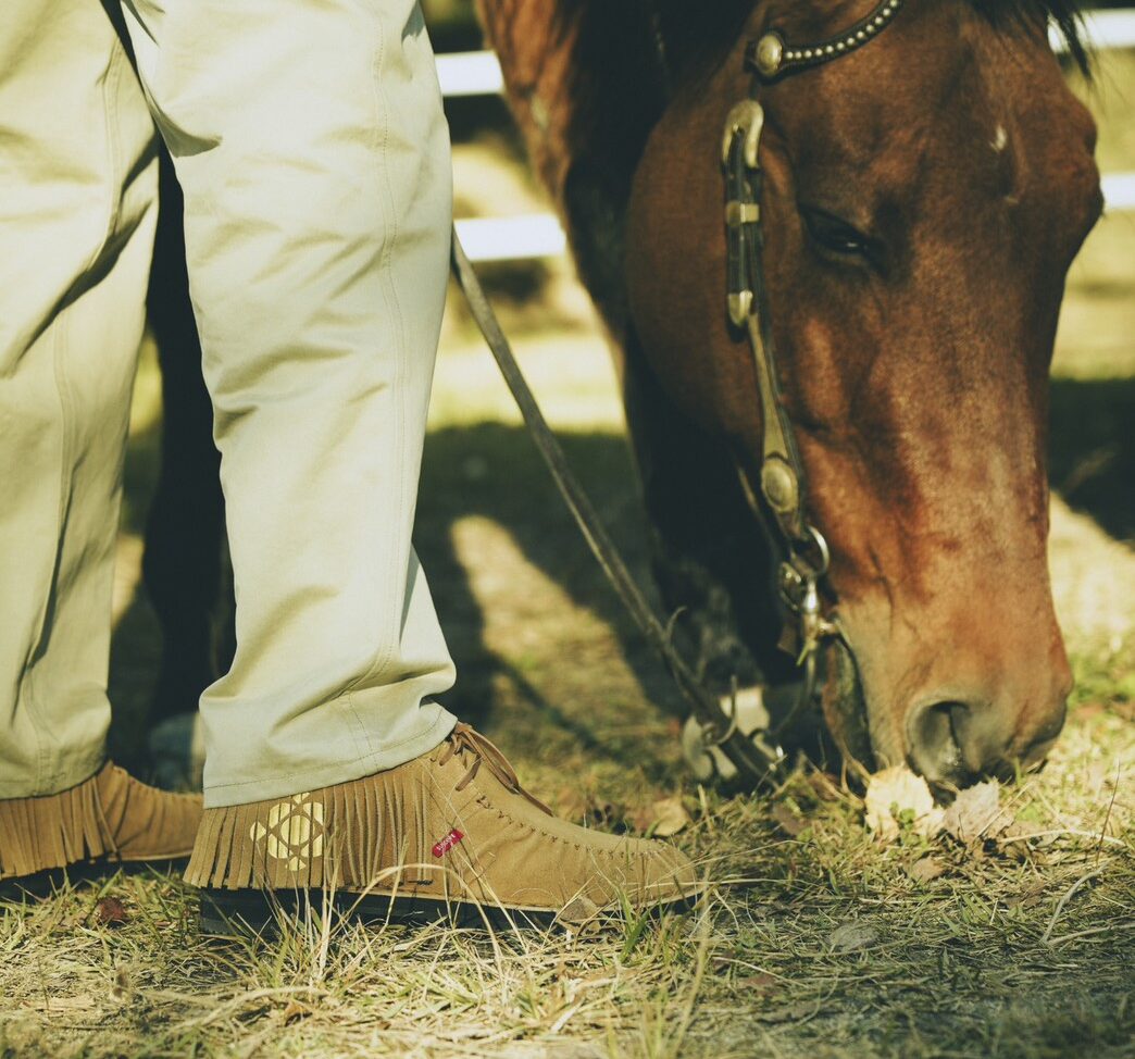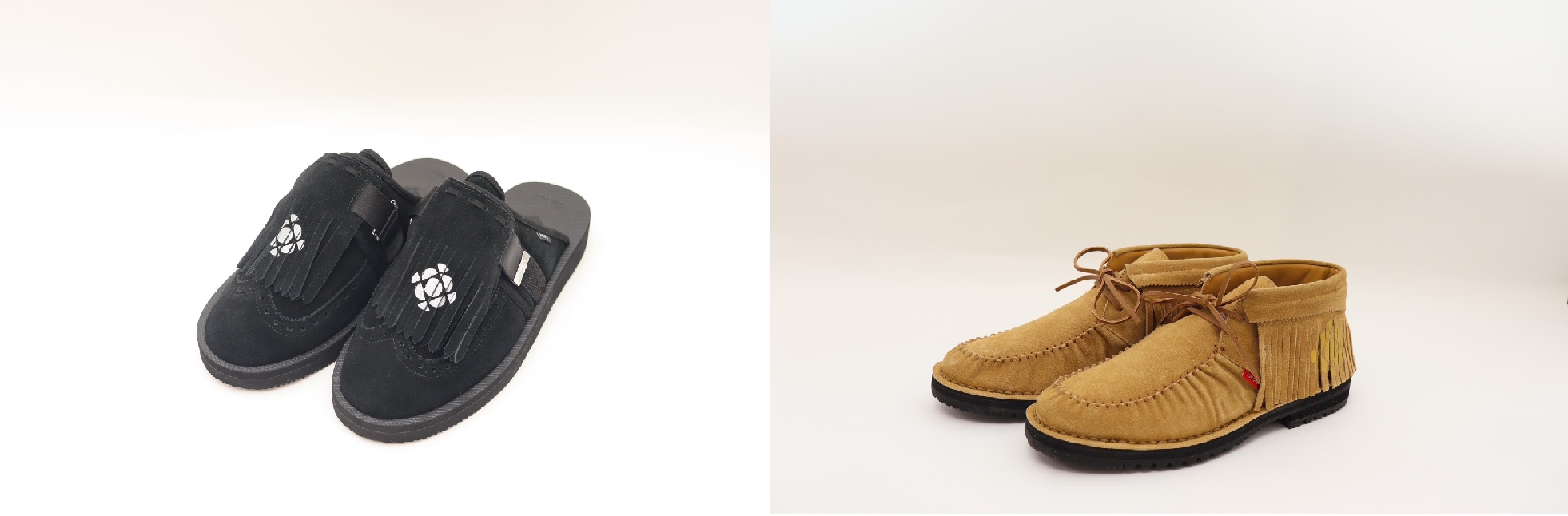 フリンジモカシンのデザインが特徴的な「FUMAD」は、撥水加工を施したカウスエードのアッパーに、防水透湿性に優れた「スイコック」オリジナルのSHERPAライニングを採用。アウトソールには、濡れた氷上やウェットフロアでも優れたグリップ力を発揮するVibram Arctic Gripを搭載し、インソールには高いクッション性を誇るSOFT STEPインソールを採用している。サイドには取り外し可能なフリンジが装着され、ブラックにはシルバー、ベージュにはゴールドで「KADSURAYA TOKYO」のロゴがプリントされており、これは簾や暖簾をイメージしたデザインで、履き口にも同ロゴを型押ししている。